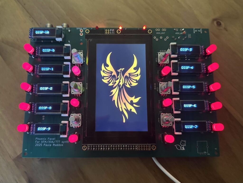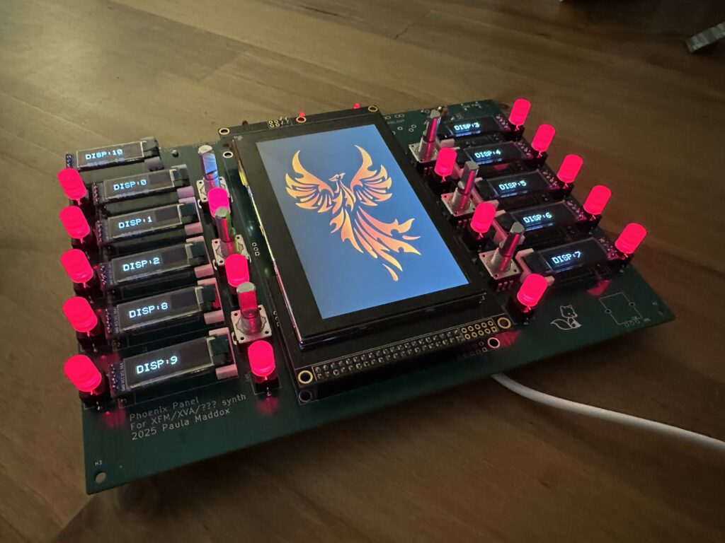 We have a 480×272 TFT with touch screen, 11 OLED displays, 6 rotary encoders, 16 buttons (with LEDs) and a pot for volume (not fitted above).